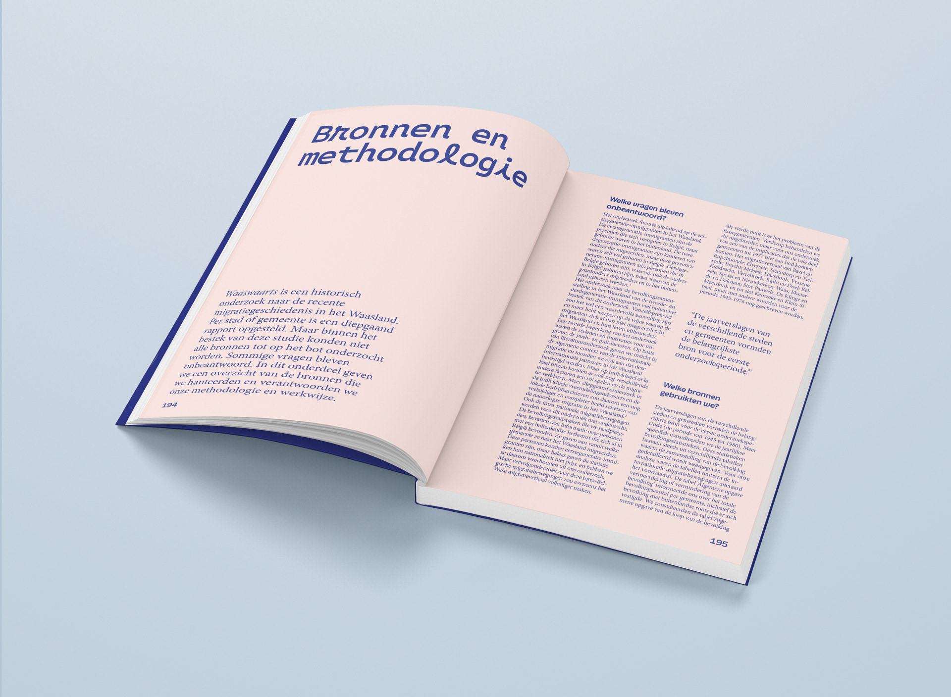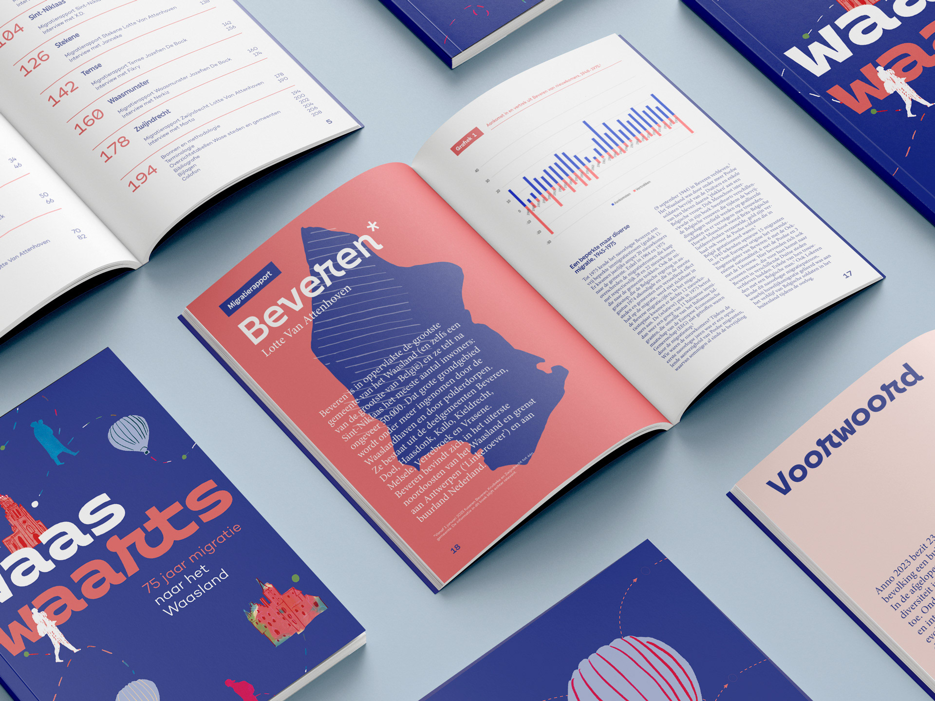 Design for a publication called 'Waaswaarts' by the Waasland Heritage Cell, written by researchers Jozefien De Bock and Lotte Van Attenhoven. The book charts 75 years (1945-2020) of post-war migration history to the Waasland region, with the aim of better understanding social issues.